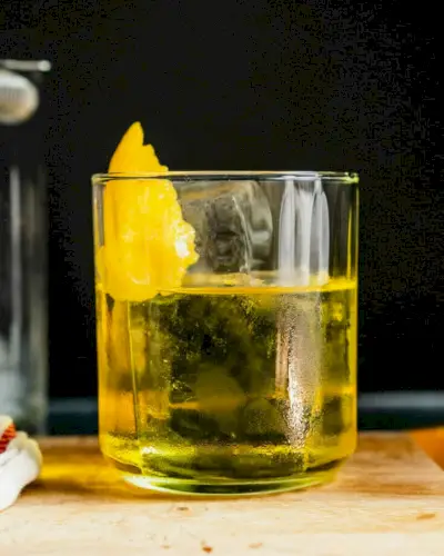 - Filtrez la boisson dans un verre lowball ou Old Fashioned. Servir avec de la glace et un quartier de citron.