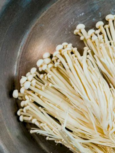 Taper: Le champignon enoki est un champignon comestible qui ressemble à de longues cordes ; presque comme des nouilles ! Les champignons Enoki sont courants dans la cuisine japonaise, où ils sont connus sous le nom d'enokitake, et dans la cuisine chinoise, où ils sont connus sous le nom de champignons à aiguilles dorées ou de lys.