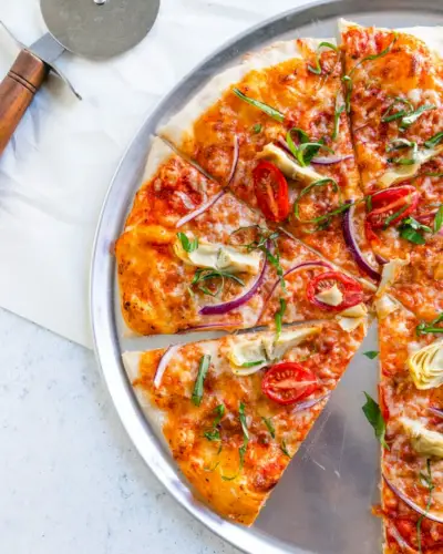 Voici une pizza classique avec une touche d'originalité : la pizza aux artichauts et tomates cerises, faite avec une pâte à pizza à croûte mince. L’utilisation d’une pâte à croûte fine réduit les calories pour obtenir une pizza plus légère mais toujours aussi délicieuse. Les artichauts acidulés apportent un maximum de saveur, perchés sur un rouge aillé sauce à pizza .