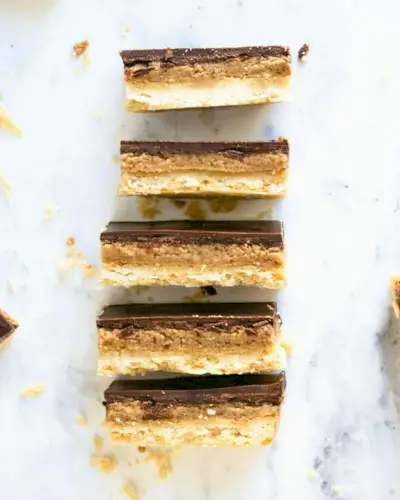Avez-vous déjà mangé des barres Millionnaire ? Parfois appelés sablés du millionnaire, il s'agit d'une barre superposée de sablés, de caramel et de chocolat : comme les bonbons Twix ! Mais ce cookie est originaire des îles britanniques et c’est une délicieuse friandise faite maison. Cette interprétation de cette célèbre barre remplace la couche de caramel par du beurre de noix de pécan. C'est riche et décadent, mais apporte tous les nutriments et les protéines végétales des noix de pécan !
