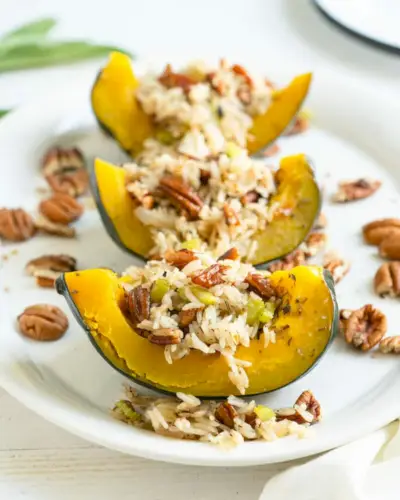 Envie d’une recette de plat principal aux pacanes ? Cette courge farcie est rôtie jusqu'à ce qu'elle soit tendre, puis drapée d'une farce de riz aux pacanes grillées qui donne à votre cuisine une odeur de paradis d'automne ! Vous connaissez ce parfum d'oignons, de céleri et de poireaux cuits au beurre ? Eh bien, cette recette le livre à la pelle. Cela plaît vraiment à tout le monde. Tous ceux à qui nous l’avons servi deviennent croyants… et demandent immédiatement la recette.