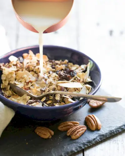 Voici une recette de céréales de petit-déjeuner maison aux noix de pécan, appelées muesli ! Le muesli est essentiellement une version saine du granola : un mélange de flocons d’avoine, de fruits secs et de noix qui est traditionnellement consommé avec du lait au petit-déjeuner. Celui-ci met en vedette des pacanes grillées et de la noix de coco, qui ajoutent un délicieux croquant, ainsi que de l'avoine, de la cannelle et des cerises séchées. Il y a tellement de saveurs que vous ne pourrez plus vous en passer !