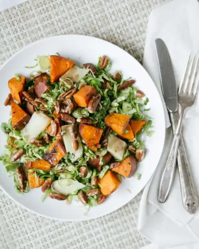 Salade de choux de Bruxelles, patates douces et pacanes