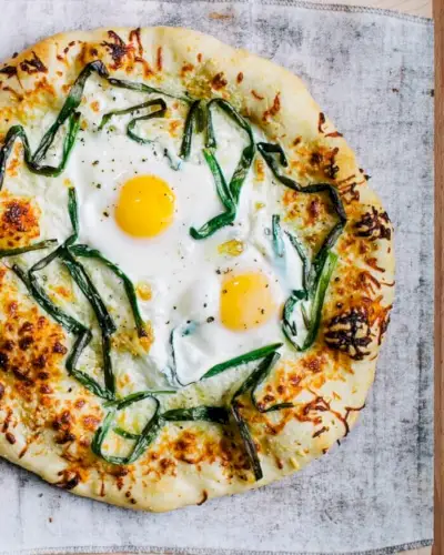 Un œuf sur une pizza ? Oui s'il vous plait! La pizza est une façon fantastique de manger des recettes aux œufs pour le dîner, puisque les œufs apparaissent traditionnellement sur toutes sortes de pizzas italiennes. Le résultat est incroyablement satisfaisant : le jaune forme une sauce gluante qui recouvre toute la pizza. Au lieu de sauce tomate, cette pizza est badigeonnée d'huile d'olive, recouverte de fromage et garnie de feuilles d'oignons verts poêlés (c'est-à-dire le dessus des oignons verts). L’œuf donne un gâchis crémeux et gluant d’une pizza aux œufs.
