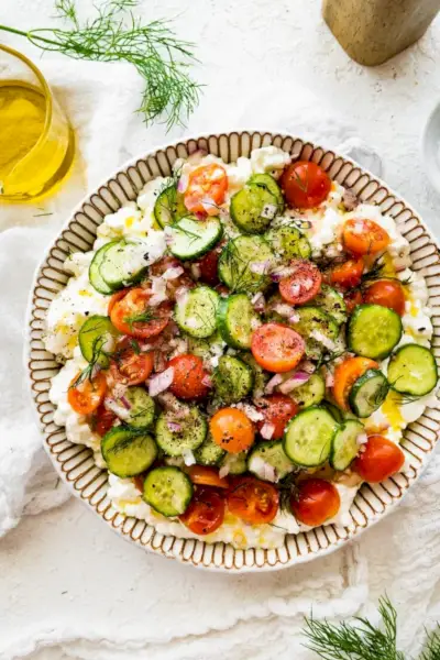 Cette salade de fromage cottage combine des légumes frais et des herbes avec du fromage cottage pour une salade simple mais savoureuse, faible en calories, mais riche en protéines. Cette salade est à base de fromage cottage riche en protéines et est garnie de légumes frais et d'herbes. via Manger de la nourriture pour oiseaux