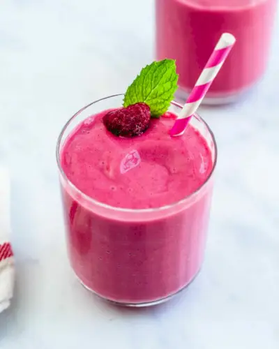 Voici l’une des meilleures recettes de smoothie au yaourt… ce smoothie à la framboise parfait ! Cette belle purée a tout pour plaire : la meilleure saveur acidulée et sucrée, une texture crémeuse et givrée et une superbe couleur brillante. Celui-ci a été instantanément un favori dans notre maison ! C’est l’un des smoothies les plus rafraîchissants que vous puissiez trouver. C'est aussi un régal : la fin parfaite d'un repas d'été.