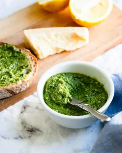 Avant d’arriver à la fin de ces recettes au pesto… parlons du pesto végétalien ! Avez-vous une alimentation à base de plantes ? Cette sauce classique vert émeraude est traditionnellement préparée avec du parmesan. Mais ne vous inquiétez pas : le pesto végétalien est également très bon ! Rendez-vous pour découvrir notre secret pour obtenir cette saveur de fromage. Ou essayez notre Pesto végétalien aux noix de cajou , qui contient des noix de cajou au lieu des pignons de pin traditionnels (ils sont plus faciles à trouver et moins chers).