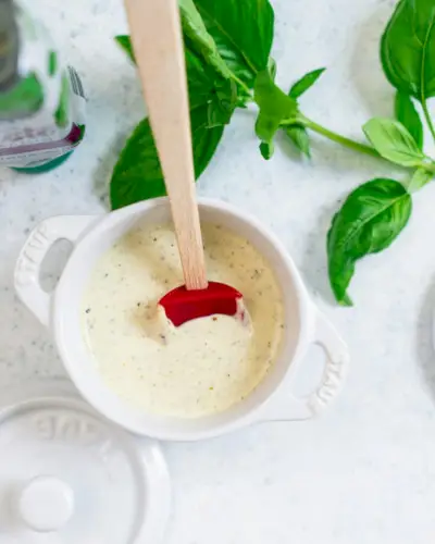 Une autre idée de recette de pesto : mélangez-le à une vinaigrette crémeuse pour ajouter plus de saveur ! Il s'avère que cette sauce vert émeraude ajoute le parfait coup de pouce aux salades. Cette version est une vinaigrette saine qui contient beaucoup moins de calories que la vinaigrette typique. C'est un peu comme une vinaigrette ranch, mais avec du pesto.