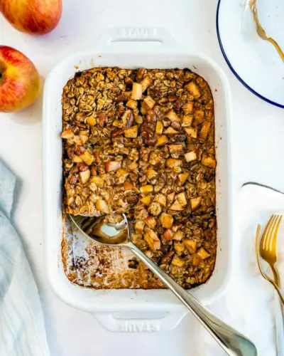 Voici notre façon préférée de manger des pommes au petit-déjeuner : ce gruau aux pommes au four ! C’est facile à préparer avec des ingrédients que vous avez peut-être déjà sous la main. Et la saveur des pommes tendres et sucrées accompagnée de sirop d’érable, de cannelle et de piment de la Jamaïque… eh bien, vous aurez envie d’en faire tous les jours ! Cela fonctionne comme une recette de brunch pour se divertir, ou vous pouvez préparer une grande poêle et en manger pour le petit-déjeuner toute la semaine.