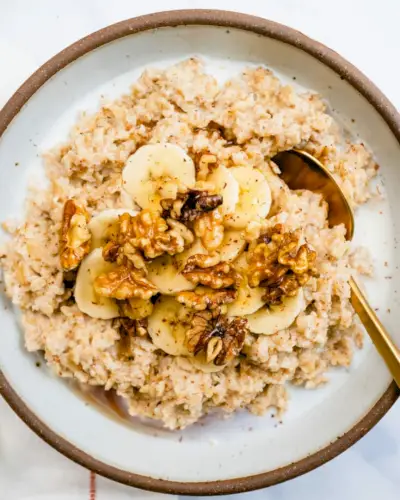 Essayez ce gruau crémeux à la banane ! L'ajout de banane à vos flocons d'avoine du matin ajoute un peu de douceur naturelle et une texture crémeuse. Ici, il est contrebalancé par des épices chaudes et de la vanille pour créer une ambiance chaleureuse et petit déjeuner facile . Nous cherchons toujours des moyens de varier notre consommation quotidienne de flocons d’avoine. Celle-ci est une variante amusante, parfaite pour s’intégrer dans la rotation !