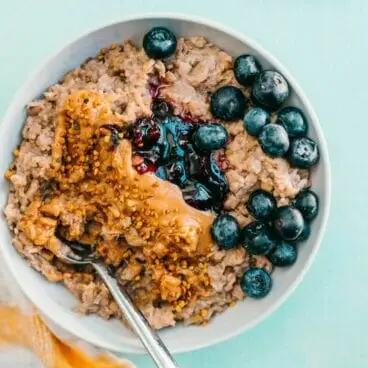 Cette recette de flocons d'avoine a un goût incroyable : elle est pleine de saveurs grillées ! C’est végétalien, c’est donc une façon à base de plantes de commencer la journée. ET il est plein de protéines végétales, donc il est vraiment rassasiant : vous êtes littéralement rassasié pendant des heures après l'avoir mangé. Garnissez-le de beurre de cacahuète et de confiture de fraises saine, et c'est une révélation.