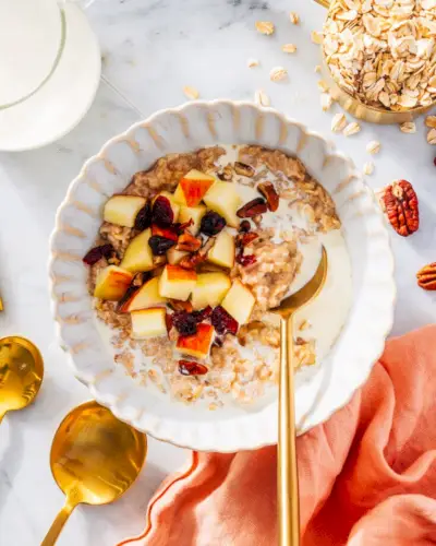 Les mots « gruau pomme-cannelle » vous font-ils d’abord penser à un paquet de gruau instantané ? Il s’avère que c’est infiniment plus délicieux fait maison ! Cette recette de flocons d'avoine est chaleureuse et réconfortante, faite avec de vrais fruits frais et assaisonnée de cassonade, de cannelle et d'un soupçon de piment de la Jamaïque. Quand il s'agit de confort petits déjeuners sains , c'est roi !
