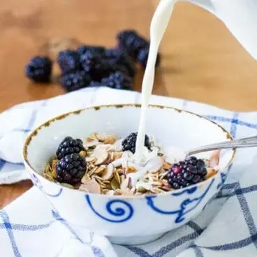 Le muesli est une céréale de petit-déjeuner faite maison : elle ressemble au granola mais sans huile et très peu d’édulcorant. Ce petit-déjeuner à base de plantes est un favori des fans, parfumé à la cannelle avec de la noix de coco grillée, des pacanes et des cerises séchées. Garnissez de votre lait d’amande ou de votre lait d’avoine préféré et dégustez !