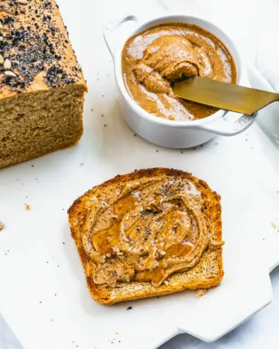 Prochaine étape de nos idées de petit-déjeuner végétalien : des toasts ! C’est ultra simple, mais c’est quelque chose qu’on mange tout le temps. Sans blague, nous aimons les toasts au beurre de noix pour le petit-déjeuner. C’est plein de protéines et nous rassasie toute la matinée ! Utilisez du beurre d'amande du commerce ou fait maison beurre de cacahuète , beurre d'amande , beurre de cajou , ou beurre de noix si vous avez un robot culinaire. Garnir de baies ou de miel. Pour plus de style, essayez notre Confiture de fraises facile pour un délicieux repas du matin.