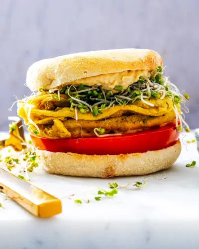 Ce sandwich végétalien pour le petit-déjeuner est une option salée amusante avec une garniture unique que vous adorerez ! Il ne faut que 5 minutes pour préparer une crêpe aux pois chiches savoureuse qui a étonnamment une saveur et une texture similaires à celles des œufs brouillés. Empilez-le sur un muffin au levain grillé avec de la tomate et de l'avocat et c'est donc satisfaisant : et totalement à base de plantes !