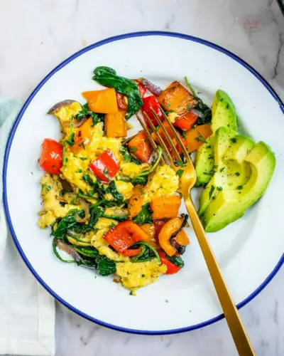 Vous voulez manger plus de légumes au petit-déjeuner ? Vous n'êtes pas seul. Manger plus de légumes pour commencer la journée commence à être une tendance. Alors pourquoi ne pas réinventer le petit-déjeuner ? Infusons également des légumes dans le premier repas de la journée. Essayez cette recette de légumes brouillés pour le petit-déjeuner ! Vous pouvez le préparer de deux manières : avec des œufs ou tofu , en fonction de votre alimentation. Il est plein de saveurs savoureuses… et regorge également de nutriments.