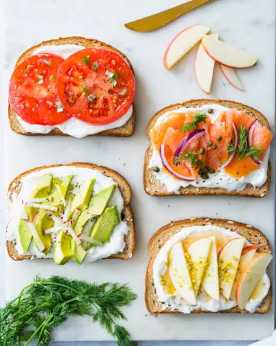 Voici une idée simple et géniale qui a un goût bien meilleur que la somme de ses parties : du pain grillé à la ricotta ! Étalez du fromage ricotta sur du pain grillé, puis garnissez-le de garnitures sucrées ou salées. Optez pour le basique avec des tomates mûres juteuses et un filet d'huile d'olive, ou copieux avec du tendre saumon fumé, des câpres et de l'aneth frais.