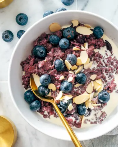 Parfois, une recette arrive si simple et savoureuse que nous avons hâte de la partager avec vous. C’est le cas de ce gruau aux bleuets ! Ce pot d’avoine a une irrésistible saveur de baies sucrées nuancée de cannelle, de piment de la Jamaïque et d’un soupçon de vanille. La couleur est encore meilleure : la teinte violet brillant rend le petit-déjeuner encore plus amusant.