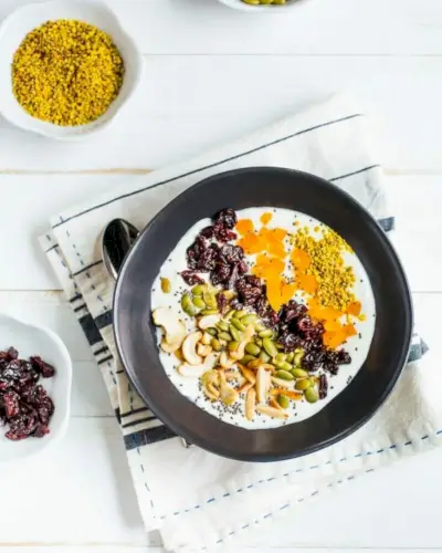 Ce bol protéiné au yaourt combine des protéines et des glucides pour un petit-déjeuner sain et copieux ! Garnissez le yaourt grec de cerises acidulées séchées, d'abricots, de noix de cajou, de graines de citrouille et de graines de chia pour une façon délicieusement saine de commencer la journée.