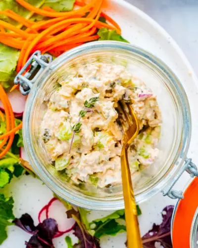 Voici un déjeuner santé et facile pour pimenter votre routine : la salade de thon méditerranéenne ! Cette rotation ajoute du croustillant De style méditerranéen des légumes et remplace la mayonnaise classique par de l'huile d'olive et du vinaigre. La saveur est si fraîche et délicieuse que vous pouvez abandonner complètement la version mayonnaise. Mangez-le avec des craquelins sans gluten ou transformez-le en wraps de laitue.