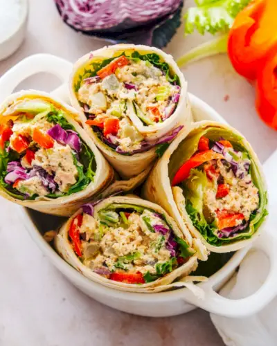 Cette recette de wrap au thon est une façon amusante et savoureuse de varier votre routine du déjeuner : aucune cuisson n'est requise. Il regorge de saveurs, avec une garniture de salade de thon piquante et des légumes frais et croquants. Roulez le tout dans une tortilla et vous êtes prêt pour une recette facile. déjeuner sain ou un dîner simple sans cuisson.