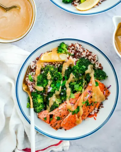 Dernière nouveauté de nos recettes du midi : le Salmon Bowl ! Ici, le poisson tendre et assaisonné est agrémenté de riz, de brocoli tendre et croustillant et recouvert d'une sauce éclatante facile et crémeuse. Utilisez du saumon fumé pour une préparation super simple ! Essayez le Vinaigrette Tahini ou Vinaigrette Miso , et préparez-vous à être étonné .