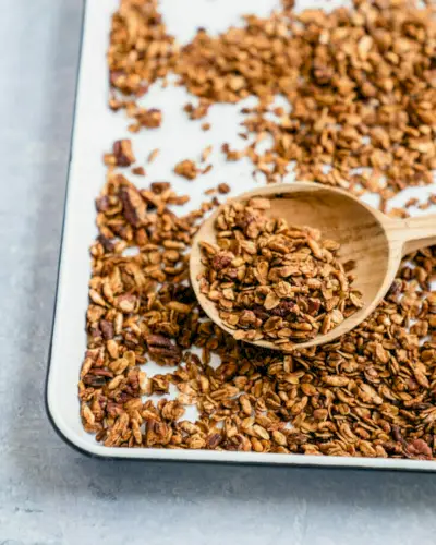Une excellente recette de petit-déjeuner à préparer à l’avance est le granola sain ! Servez-le sur du yaourt, ou avec du lait d'amande ou du lait d'avoine. Notre granola à l'érable et aux pacanes préféré est faible en calories et toujours riche en nutriments... et plein de saveur grillée et chaleureuse. Ou essayez le muesli : c'est similaire au granola mais avec de l'avoine crue et moins de sucre.