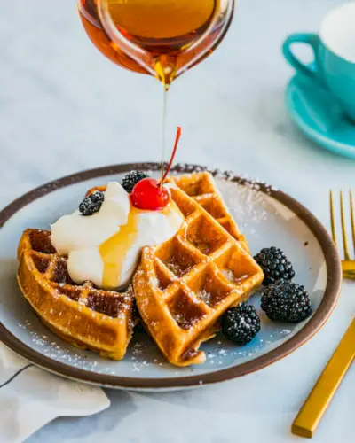 Les gaufres vous rapportent des points importants auprès de vos amis et de votre famille en tant que recette spéciale de petit-déjeuner du week-end ! Celui-ci est facile à préparer et plein de saveurs, parfait pour le brunch du dimanche ou à tout moment où vous avez besoin d'impressionner. Les gaufres sont parfaitement moelleuses, pleines de saveurs avec une courte liste d'ingrédients. Garnir de toutes les meilleures garnitures (comme sauce aux fraises ) et profitez-en.