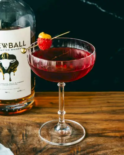 Vous cherchez une boisson unique au whisky et au beurre de cacahuète ? Essayez le Peanut Butter and Jelly, un cocktail acidulé et sucré original à base de beurre de cacahuète Skrewball et de jus de canneberge. Cette combinaison improbable fait de la version cocktail de votre sandwich d’enfance préféré ! Nous nous sommes inspirés de la co-fondatrice de Skrewball elle-même, Brittany Yeng, qui recommande associer ce whisky aromatisé à la canneberge pour couper la douceur.