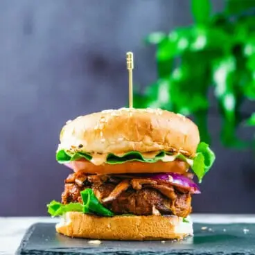 Manger des aliments à base de plantes ne signifie pas renoncer au burger ! Les hamburgers végétariens peuvent être très satisfaisants, et cela ne signifie pas pour autant des substituts de viande transformés. Ces hamburgers végétaliens aux pois chiches remplis d'aliments entiers peuvent être votre nouveau favori ! Ils sont croustillants à l’extérieur et tendres à l’intérieur, avec une touche nuancée de paprika fumé. Peints avec de la sauce barbecue et servis avec du bacon shiitake et de la mayonnaise épicée, ils sont sacrément savoureux (si nous le disons nous-mêmes). Prêt à cuisiner ?