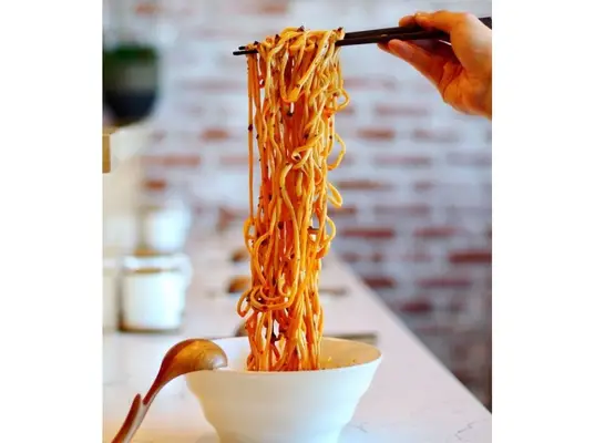 Utilisation de techniques de production de pâtes qui sont exclusivement pour le shanxi dans le nord de la Chine, Nouilles artisanales Shang L'objectif est d'honorer et d'augmenter la tradition culinaire chinoise dans les pâtes faites à la main et d'augmenter comme énoncé de mission. Critique Alé Am Shang, Chow Mein et la soupe de pâtes épicée Wonthon.