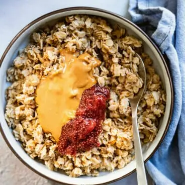 Il est également facile d’utiliser des garnitures à base de flocons d’avoine à base de plantes ! Nous avons garni ce meilleur gruau de nos garnitures préférées : beurre de cacahuète et gelée entièrement naturels ! Voici ce que nous avons utilisé et quelques autres de nos garnitures préférées :