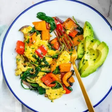 Vous voulez manger plus de légumes ? Préparez ce petit-déjeuner aux légumes brouillés ! Il contient beaucoup de légumes colorés pour bien commencer la journée… avec une option à base de plantes/végétalienne.