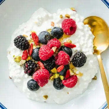 Ces bols de petit-déjeuner au fromage cottage sont un petit-déjeuner sain et facile ! Garnissez-les de baies ou de pommes, de cannelle et d'un soupçon de miel.