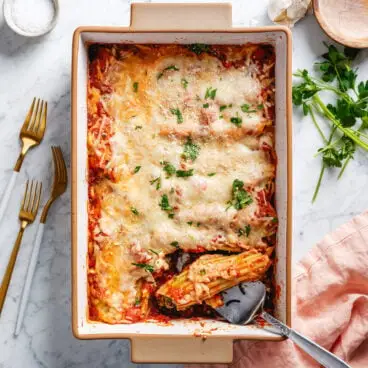 Envie d'une pâtisserie de pâtes conviviale ? Essayez ceci recette de manicottis , une cuisine réconfortante italo-américaine classique à son meilleur ! Il y a quelque chose de si irrésistible dans les tubes de pâtes remplis de trois fromages et baignés de sauce tomate piquante à l’ail. Cette recette est vraiment la façon la plus simple de préparer des manicotti : tu n'as même pas besoin de faire bouillir des pâtes ! Aucune cuisson sur la cuisinière requise et aucun tube de pâtes fragiles farcis. Remplissez-les à sec, puis mettez-les au four pour pouvoir profiter de tout le fromage crémeux et de la garniture salée sans problème !