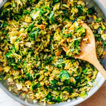 Envie d’une façon rapide et irrésistiblement savoureuse de cuisiner les choux de Bruxelles ? Essayez-les facilement Choux de Bruxelles rasés , alias Bruxelles râpé ! Vous pourriez d’abord penser à rôtir ce légume populaire, mais voici une alternative. Râpez-les en fines tranches, mélangez-les avec le parmesan, l'ail et les échalotes et faites cuire jusqu'à ce qu'elles soient dorées. Il s'avère plumeux et débordant de saveur savoureuse, contrastant avec le goût de noisette des pousses. C’est encore plus rapide que de rôtir ces bébés et tout aussi satisfaisant… sinon plus ! Ce plat d'accompagnement fonctionne pour le dîner ou même le petit-déjeuner avec des oeufs : et il a disparu très vite chez nous.