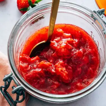 Ce recette de compote de fraises fait une sauce épaisse et sucrée qui est parfaite pour arroser de la crème glacée, des gaufres, un gâteau au fromage et plus encore !