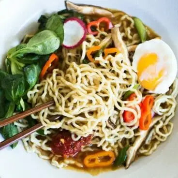 - Certaines nouilles ramen contiennent également des œufs, alors vérifiez les ingrédients de vos nouilles pour vous assurer qu'elles sont végétaliennes ou remplacez-les par des nouilles de riz.