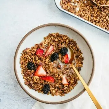 Le petit plus de cette recette de granola healthy : c’est aussi une idée cadeau maison amusante ! Jetez-le dans un bocal en verre et c'est une idée de cadeau pour les nouvelles mamans, ou un cadeau de pendaison de crémaillère pour des amis ou des voisins. C’est le cadeau fait maison parfait – ou le petit-déjeuner – ou la collation – qui est à la fois sain. Faites-nous savoir si vous l'essayez dans les commentaires ci-dessous !