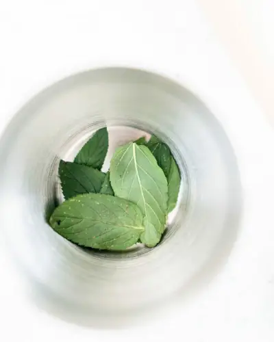 - La bonne façon d’écraser la menthe : Placez les feuilles de menthe au fond d'un shaker ou d'une grande tasse ou bol en métal. À l'aide d'un pilon à cocktail en bois ou d'une cuillère en bois non finie, écrasez délicatement la menthe 3 à 4 fois pour en libérer le jus. Cela devrait ressembler à ceci.
