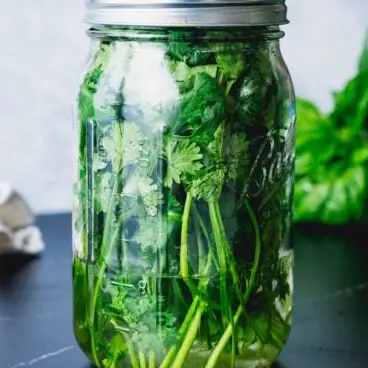 - Utilisez un grand pot de conserve avec couvercle ou achetez un économiseur d'herbes. Pour la coriandre, nous préférons un économiseur d’herbes, car c’est juste la bonne hauteur et la bonne largeur pour un bouquet de coriandre. Voici l’économiseur d’herbes que nous utilisons depuis des années. (Vous pouvez l'utiliser pour toutes les herbes fraîches !)