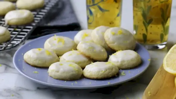Étalez le glaçage au citron sur les biscuits refroidis et décorez de zeste de citron finement râpé. Laisser reposer jusqu'à ce que le glaçage soit pris, environ 15 minutes.
