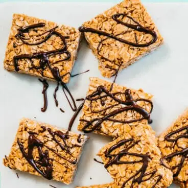 Voici notre nouvelle astuce préférée pour des friandises saines : Barres à l'avoine et au beurre de cacahuète ! C'est tout ce que vous voulez dans une friandise : une saveur sucrée irrésistible de cacahuète, une texture moelleuse et un petit filet de chocolat sur le dessus ! Ces barres de flocons d'avoine sans cuisson sont comme nos célèbres biscuits de bouchée de bonheur , mais plus facile et plus sain (si c’est possible). Et on n’en a jamais assez ! Notre fils Larson demande souvent avec un sourire narquois s'il peut avoir une barre de flocons d'avoine : et nous sommes heureux de lui faire plaisir. Cette friandise sucrée optimise l'avoine à grains entiers tout en frappant fort dans les domaines sucré, salé et satisfaisant. Allons cuisiner ! Mais en réalité… il n’y a pas vraiment de cuisine impliquée.