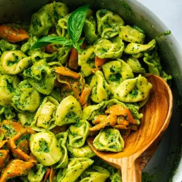 De nos jours, nous aimons les recettes simples, et si nous pouvions devenir simples avec des saveurs élevées ? Encore mieux. Voici une recette qui fonctionne comme plat principal rapide ou comme accompagnement facile : essayez ceci Tortellinis au pesto ! La sauce crémeuse aux herbes est parfaite pour enrober de tendres tortellinis (ou tortelloni… plus d'informations ci-dessous !). Parfois, nous le mangeons en plat principal avec quelques accompagnements végétariens, ou il est parfait avec du poulet ou du poisson. Voici ce que vous devez savoir !