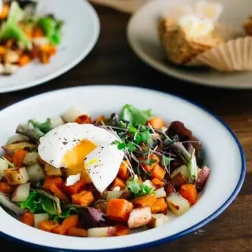 Est-ce que vous brunchez ? Nous ne le faisons pas souvent, mais lors d'occasions spéciales, nous aimons prendre un brunch tranquille le samedi matin. Voici un petit menu que nous avons créé pour vous avec notre amie Shelly de Entreprises végétariennes . Il s’est avéré si beau et coloré que nous avons oublié que c’était le milieu de l’hiver ! Ce serait parfait pour un brunch de la Saint-Valentin ou pour toute matinée spéciale. Ce œufs pochés et la recette des pommes de terre est le plat principal de notre menu brunch, et homme était-ce bon. Les patates douces et les pommes de terre rouges ont une ambiance sucrée et savoureuse qui crée une dépendance. Continuez à lire pour la recette des œufs et des pommes de terre : qui fonctionne aussi comme une simple recette de dîner !