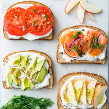 - Garnitures : L’avantage des toasts à la ricotta ? Cela fonctionne sucré ou salé. Ajoutez les légumes, protéines ou fruits de votre choix. Voir ci-dessous pour plus d'options !