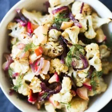 Les pommes rôties et le chou-fleur sont un accompagnement savoureux, sucré et salé qui convient à divers régimes (végétalien, sans produits laitiers, sans gluten). Cette recette prend environ 50 minutes à préparer, mais le temps est généralement sans intervention. Et pour la saveur, chaque minute d’attente en vaut la peine. Nous aimons aussi le rendu des couleurs : le violet de l’oignon, le rose presque vif de la pomme rôtie et le vert des feuilles d’aneth moelleuses.