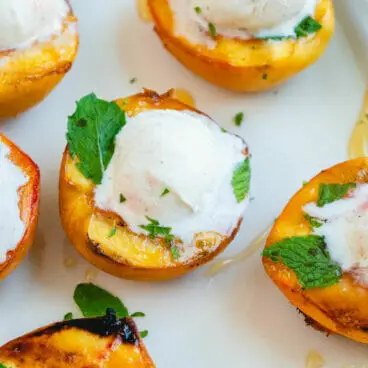 En grandissant, l'une des meilleures périodes de l'été était la tarte aux pêches de ma mère . Elle ne le préparait que pendant les quelques mois où les pêches étaient à leur meilleur, donc le manger était toujours une occasion spéciale. Et cela se terminait toujours par un lèchement de l'assiette. Voici ma façon de tricher pour obtenir cette saveur de tarte aux pêches sans aucun effort : des pêches rôties ! Ils ne prennent que quelques minutes au gril et leur goût est incroyable. Garnissez de glace fondante à la vanille et c’est l’une des meilleures friandises gustatives de l’été.