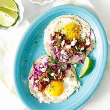 - Pour servir, placez chaque tortilla dans une assiette. Garnir d'un œuf, de sauce tomate épicée, de chou, de radis, de coriandre, d'avocat (le cas échéant), de plusieurs filets de jus de citron vert et de crumbles de queso fresco.