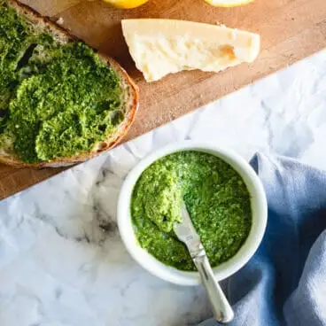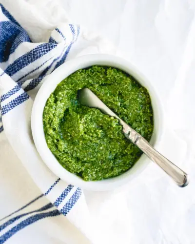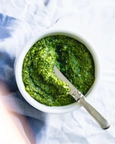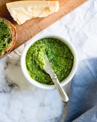 Lors de la préparation de ce pesto, je vous recommande fortement de râper votre propre parmesan à la maison. Les blocs de fromage frais du comptoir à fromages sont de bien meilleure qualité que les produits préemballés sur les étagères. Cependant, c’est aussi plus cher, donc je comprends si vous préférez quelque chose d’un peu plus économique. Si le comptoir de fromages n'est pas pour vous, optez pour le parmesan pré-râpé plutôt que pour la poudre dans un shaker (la poudre n'est pas du tout comparable au parmesan fraîchement râpé). Et si vous souhaitez en finir avec le fromage, rendez-vous directement sur notre Pesto végétalien aux noix de cajou recette!